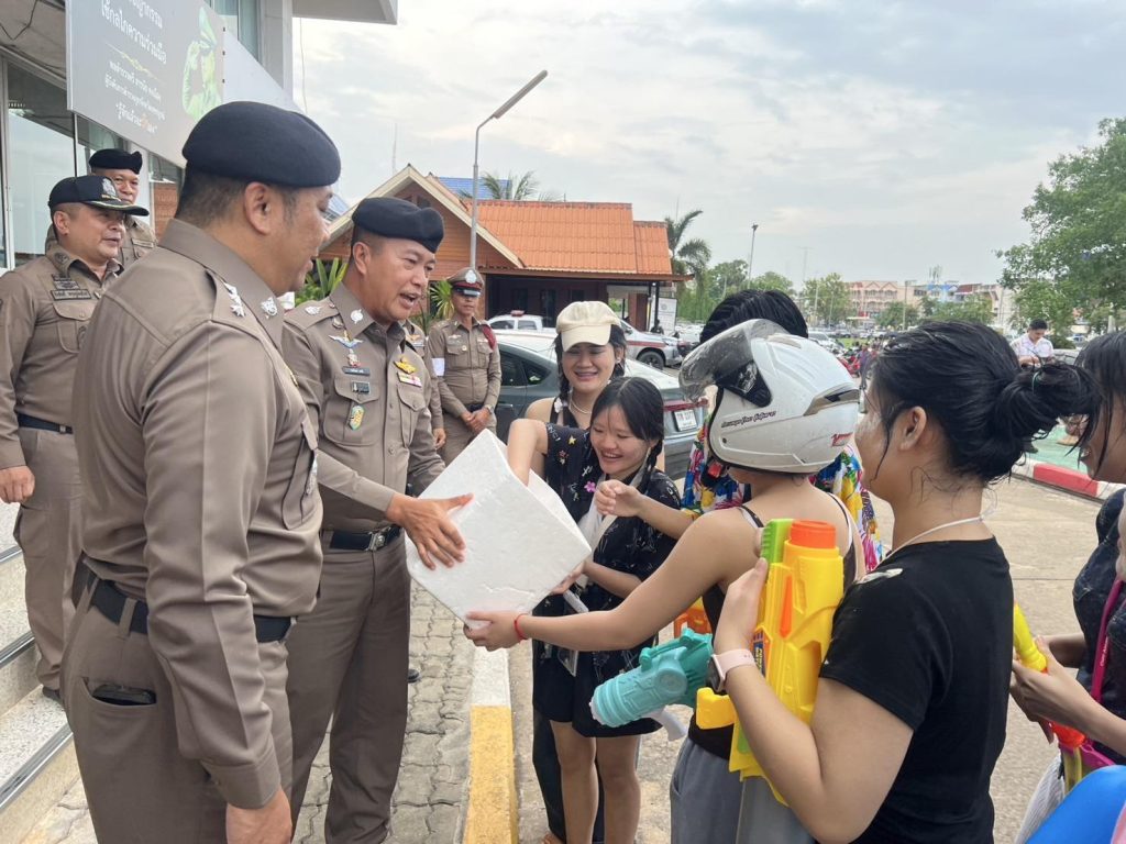 พร้อมได้มอบของที่ระลึกแก่ประชาชนที่เข้ามาใช้บริการ บนสถานีฯ ประชาสัมพันธ์ “ดื่มไม่ขับ กลับบ้านปลอดภัย, ไม่ขับรถเร็วเกินกฎหมายกำหนด สวมหมวกนิรภัย 100%”