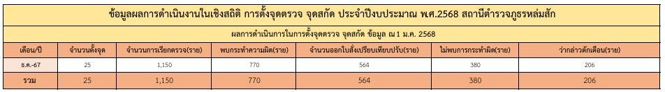 ข้อมูลผลการดำเนินงานในเชิงสถิติ การตั้งจุดตรวจ จุดสกัด เดือน มกราคม 2568