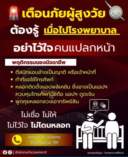 เตือนภัยผู้สูงวัย เมื่อท่านไปในที่สาธารณะ เช่น โรงพยาบาล หน่วยงานราชการต่าง ๆ ที่มีผู้คนไปใช้บริการจำนวนมาก แม้เป็นสถานที่ปลอดภัย แต่ก็อาจมีมิจฉาชีพแฝงตัวมา