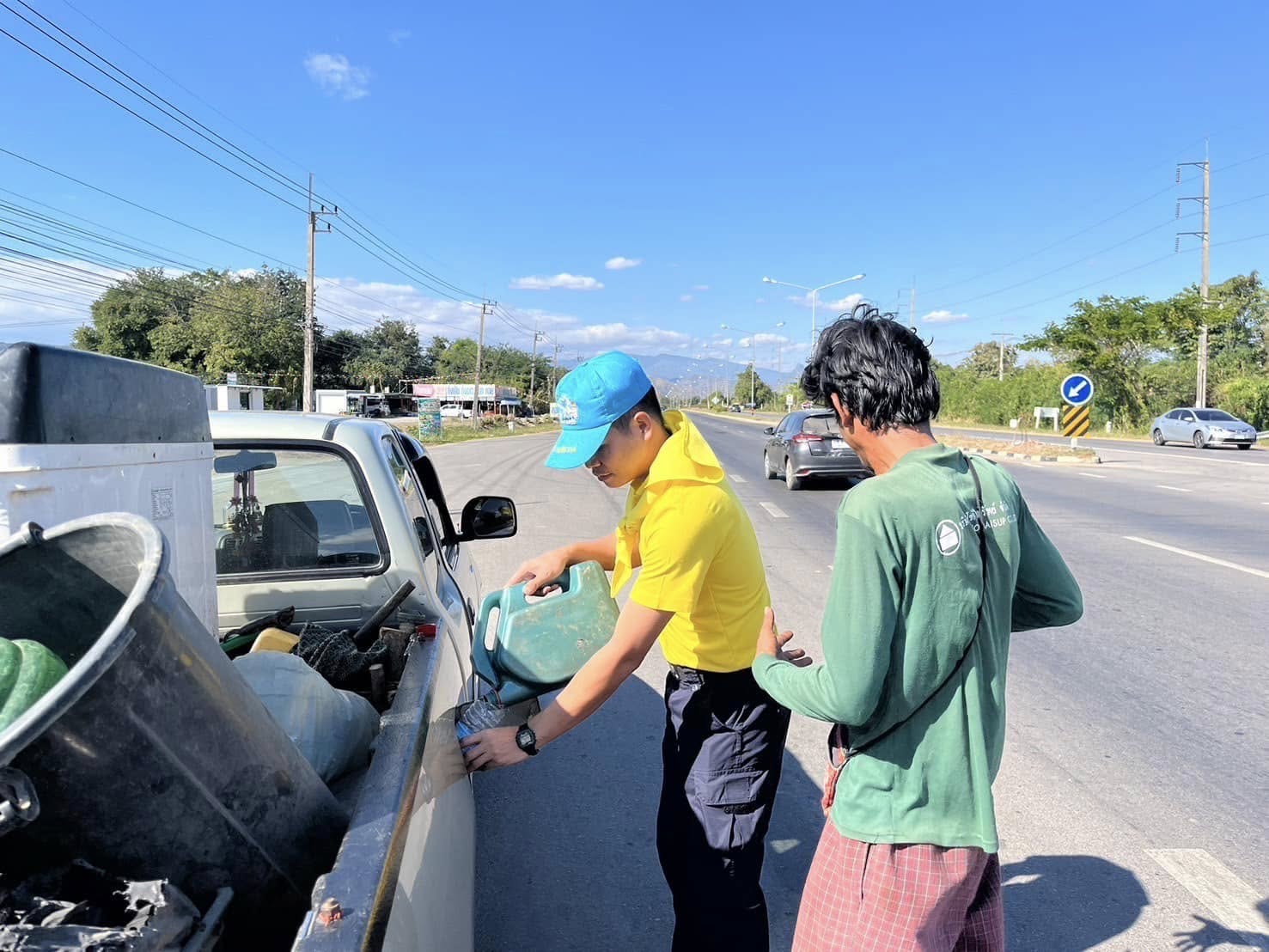 ระหว่างปฏิบัติหน้าที่ ได้มีประชาชนได้มาขอความช่วยเหลือ เนื่องจากรถยนต์กระบะที่ขับมานั้น เกิดน้ำมันหมด