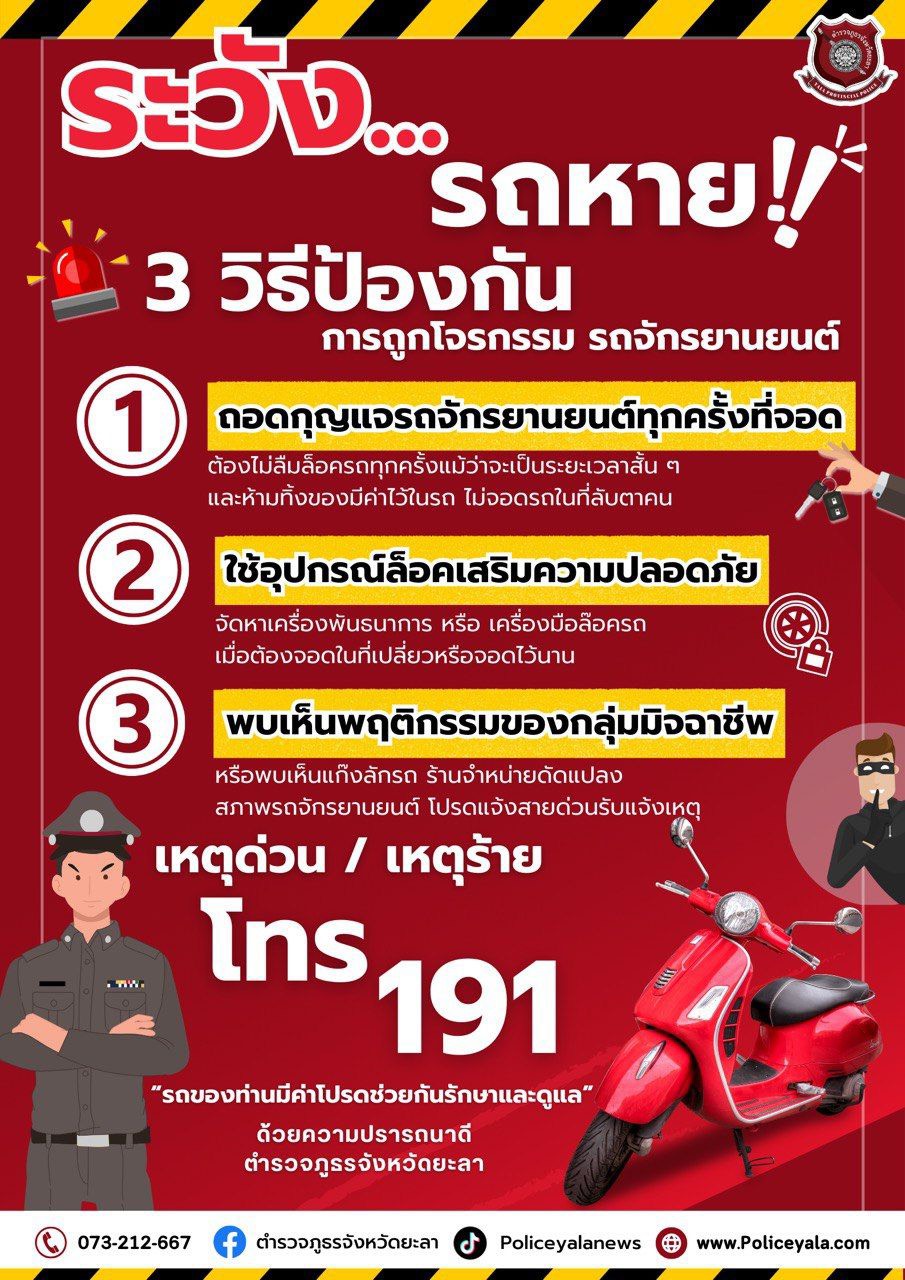 ขอความร่วมมือจากพี่น้องประชาชนจังหวัดยะลา ร่วมป้องกันรถหาย โดยเฉพาะรถจักรยานยนต์1.ถอดกุญแจรถจักรยานย